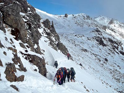 Actually, the Glovers were already out front breaking the trail. As usual, I was changing my layers fairly regularly while talking to Leigh about how office work can get in the way of monitoring Blue Duck numbers in the Wangapeka catchment. Once past the skifield I could see perhaps 20 walkers ahead. At one point, Andrea decided to lead our rear group of three straight over the ridge rock obstacle, instead of the cattle track sidle. This was a great diversion with Chris leading the layback-climbing move and being there to assist Andrea whose chest pack prevented her from swinging around the rock. Once above the hut the popular option was straight down the snow slope onto the lake. The snow was too soft for a glissade or bum slide.