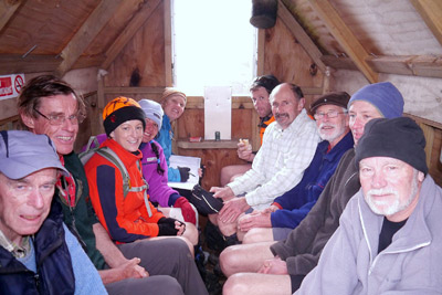 We re-grouped for lunch at Mt. Sunday Bivvy, a cute little two-bunker that would have an incredible outlook on a good day. Ian Morris ticked this one off of his hut-bagging list and happily signed the visitor book.