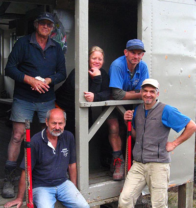 By the time the walking group had returned, the hut was well on the way to being firmly nailed in position. They were suitably impressed with the ingenuity shown in shifting the hut but were soon put to work shifting timber, cleaning up the hut and generally tidying up the site. The water-tank was relocated alongside the hut and the spouting reconnected to ensure a water supply for the next visit.