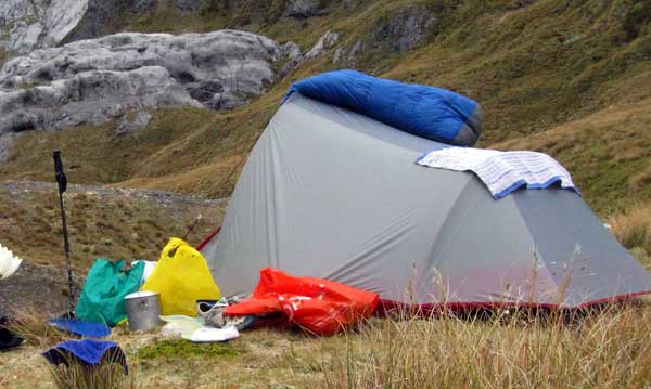 Tenting – it is a challenge to keep gear dry in wet conditions including the making or breaking of camp. Modern nylon tents with flies do not generally leak much if in good condition. But care and discipline are essential so tracking of water into the tent and gear is minimised. A pack cover is excellent, so the wet pack can stay outside the tent. Minor leaks and condensation lead to water pooling on the tent floor. Use your parka as an extra sheet to protect the foot of your sleeping bag. Have a small dish cloth to wipe up damp surfaces, including skin.