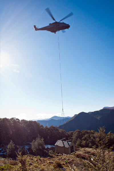 Silvano Lorandi recently participated in the initial shift of the hut about 250m to a new site in early June by DOC and the Air Force, using a heavy-lift helicopter from Ohakea. The chopper also brought in a large quantity of building materials that we had ordered. NTC, with assistance from Marlborough and Waimea TCs, now need to construct new foundations, winch the hut on and then do some renovations and a range of other tasks (e.g. water tank, toilet, fireplace).