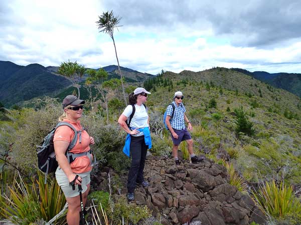 On a fine summer’s day, eight enthusiastic souls departed Victory Square, drove over the Whangamoas, then took the less-travelled road to Duncan Bay in the Tennyson Inlet. At Opouri Saddle (520m), our cars were swapped for boots, and we began the steep ascent. Up, up, up a ridge, cautiously clambering over roots and rocks. This was not an official track, but was well-marked with plastic blue triangles. Once over the crux, a 3-metre cliff requiring the use of handholds and careful foot placement, we drank in a stupendous view over Pelorus Sound to the north. Views over to Tasman Bay and south to the distant Richmond Ranges were enjoyed. This was the first of a series of rocky promontories which offered relaxing rests en route.