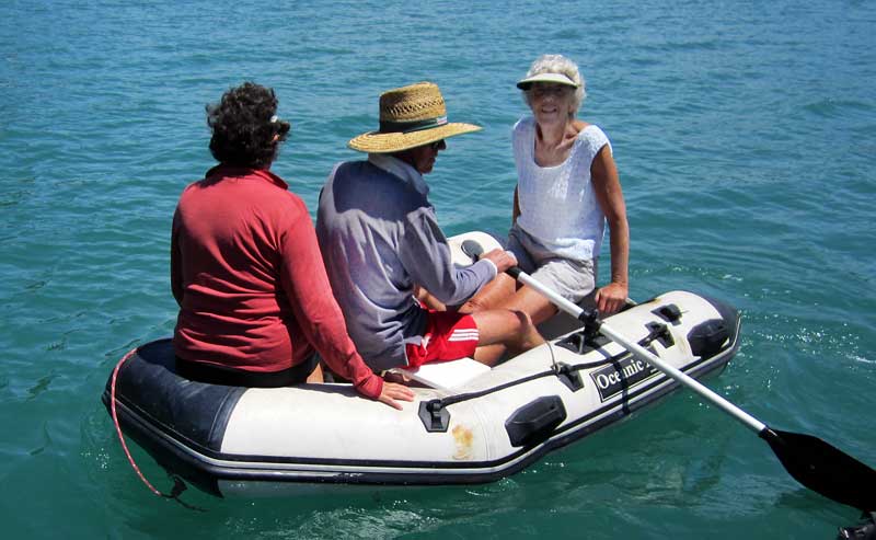 Brian quickly spotted us on the beach and rowed ashore to ferry us in his rubber ducky to the comfortable 30-foot yacht, where after a safety briefing by the captain, we became “the crew”. Conditions were ideal for cruising and we were soon underway with crew members taking turns to help with sailing the boat towards Bark Bay.