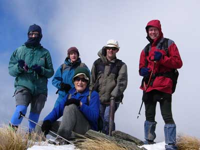 Lunch in the lee of the ridge under Gordon's Pyramid was followed by snow flurries and clag. Miraculously it cleared when we reached the top of the Pyramid with excellent views to the west, (Tablelands), north (Lodestone, Crusader, etc.) and northeast to Tasman Bay.