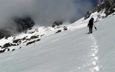 We finally emerged from our sacks and left the hut under clearing skies around 9am, for a look. Chris was sensible and stayed in bed as he hadn’t intended to do the climb. Once out of the bush and on the traverse to the base of Mt Cupola, the snow improved dramatically, to only ankle-deep. Mike was firing well, no doubt to the greatly reduced weight on his back, Pat was his usual steady self and I was totally lacking in enthusiasm. Maybe due to the previous day’s exertions or the aftermath of the flu that I had just recovered from. Whatever, I turned around part way up the gully, arriving back at the hut 1pm for an afternoon snooze.