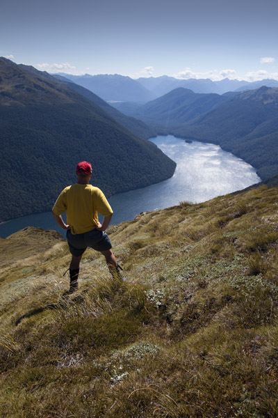 Resting on the lip of this natural amphitheatre, we drink from a beautiful brook which cuts through the grass. In three hours we have gained the ridgeline and I trot off along the tops to photograph the lake from a nearby hilltop.