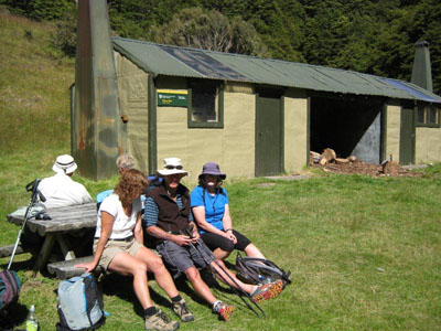 We amp up the relatively level pack-track to the six-bunk Devils Creek Hut, a good place for a brew up before the hard work begins. (1:15). A DOC ranger had been here the day before mowing the lawn.