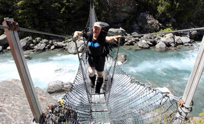 But the last kilometre to the hut is brutal, as we negotiate some serious windfall, and our tired limbs are screaming blue murder, after nearly eight hours on our feet. A swing-bridge gives access to the old NZFS hut sited on a clearing by the Blue-Grey River.