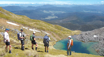 At Sunday breakfast we were charmed with a fly-past of three kea over our tents. We set off in two groups, the fit party to climb Iron Hill through the rocks above Lake Iron, and the medium party gaining the ridge of Iron Hill by skirting Little Lake Sylvester and then ascending through tussock basins to the red scree slope on the eastern flank. Quite amazing, but it was the first time for all of us that we stood here. As strong winds on the ridge exhilarated us, we identified as much as possible of the world spread out around us.